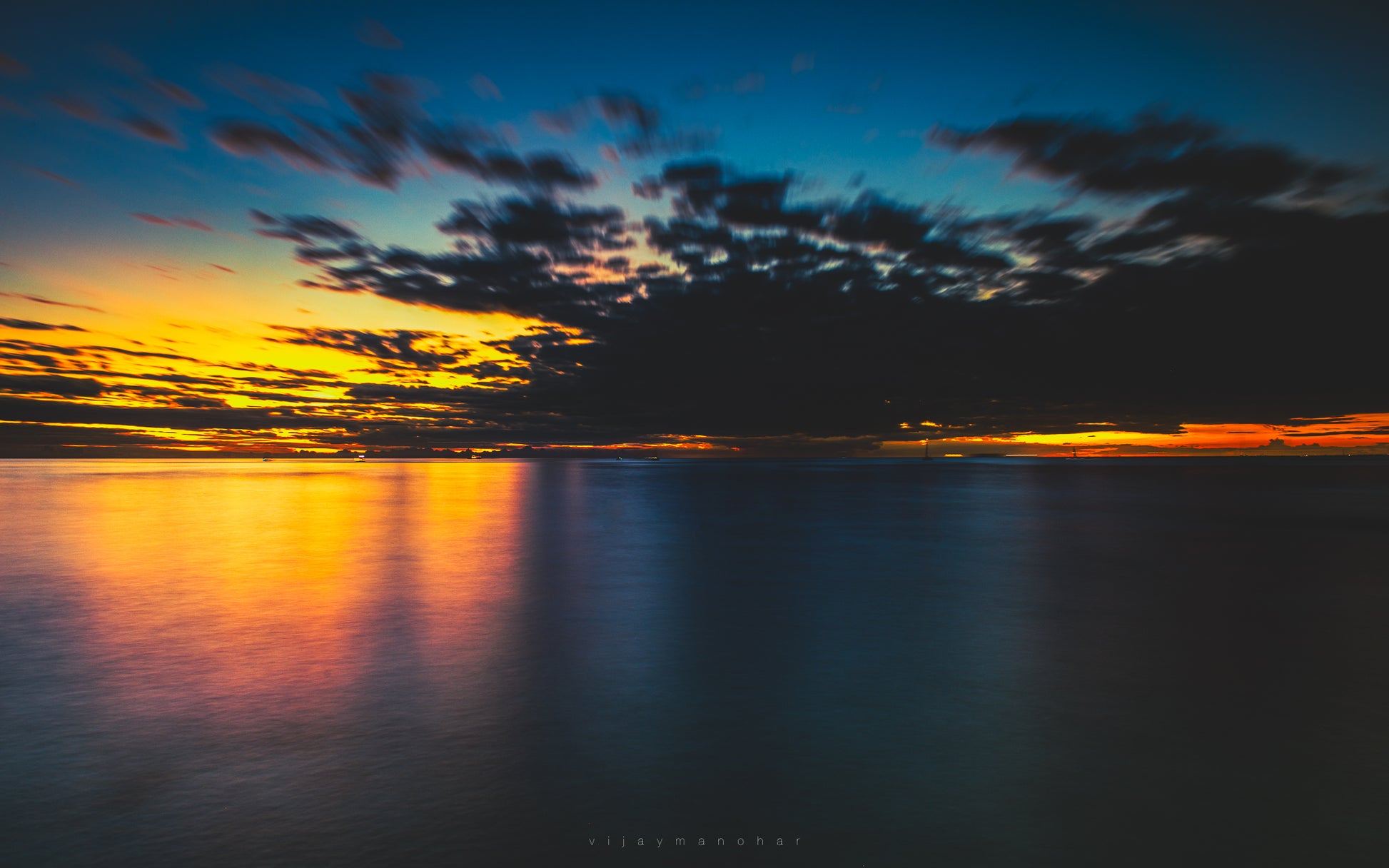 As the sun dips below the horizon, the sky becomes a canvas painted with hues of fiery orange, soft pink, and deep purple, casting a serene glow over the tranquil ocean