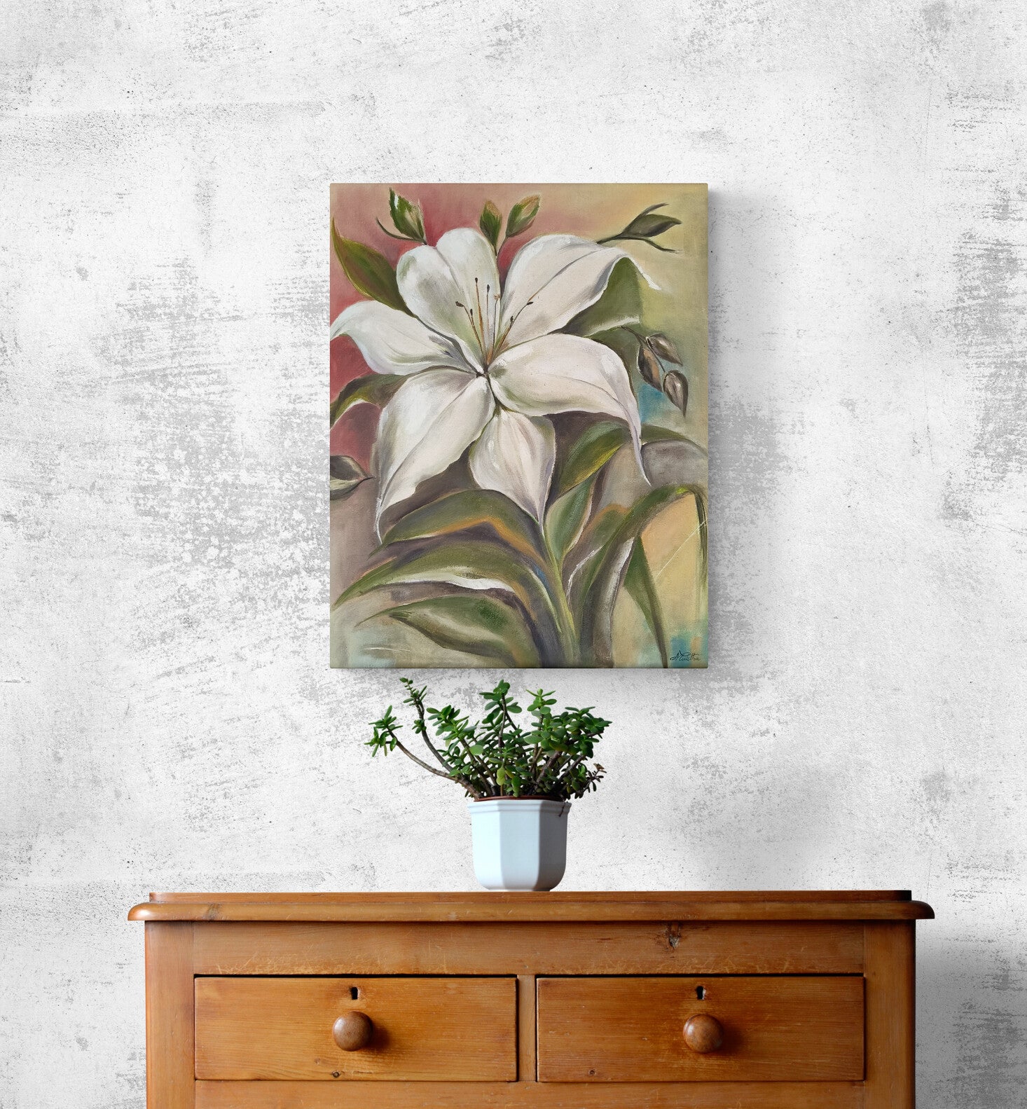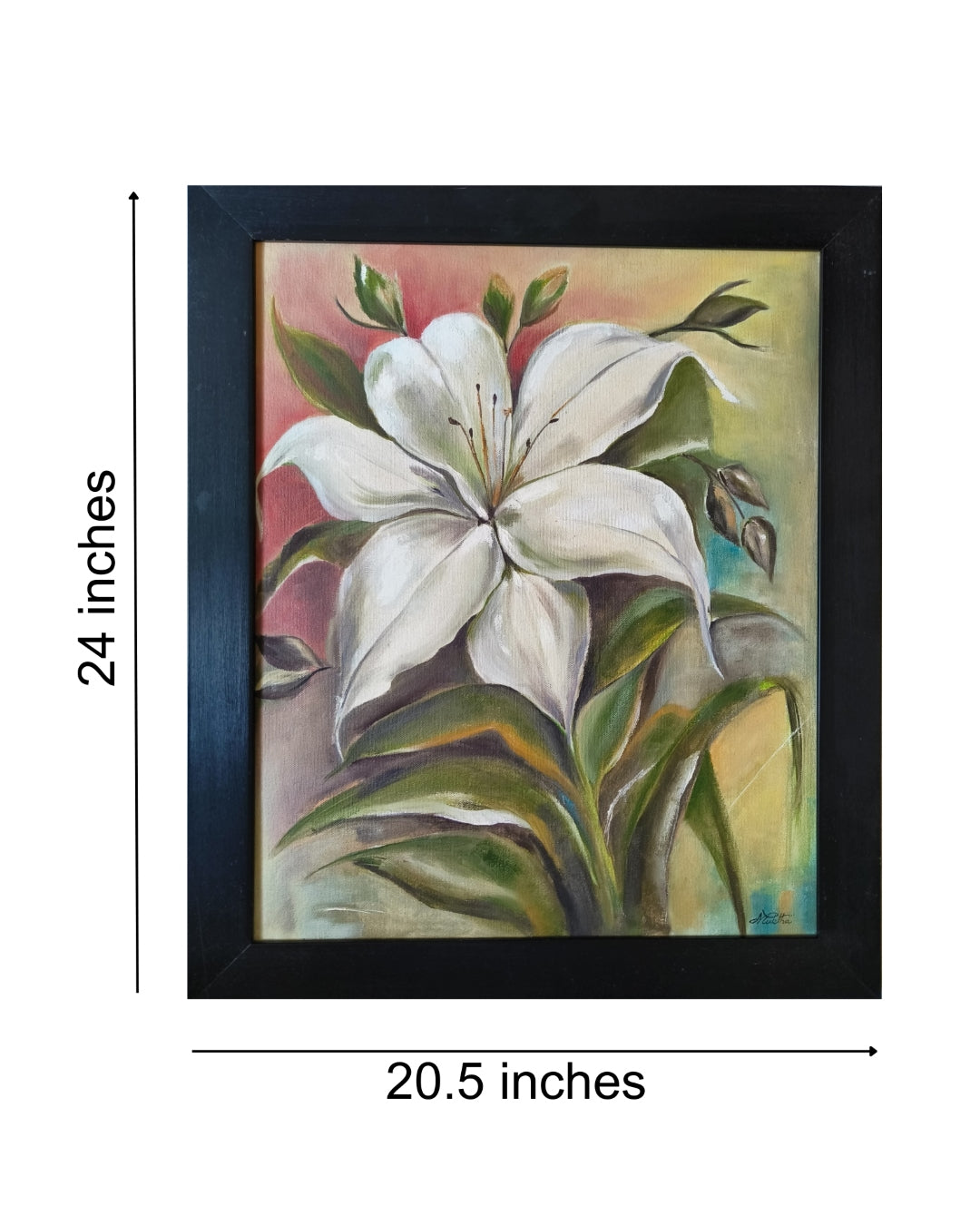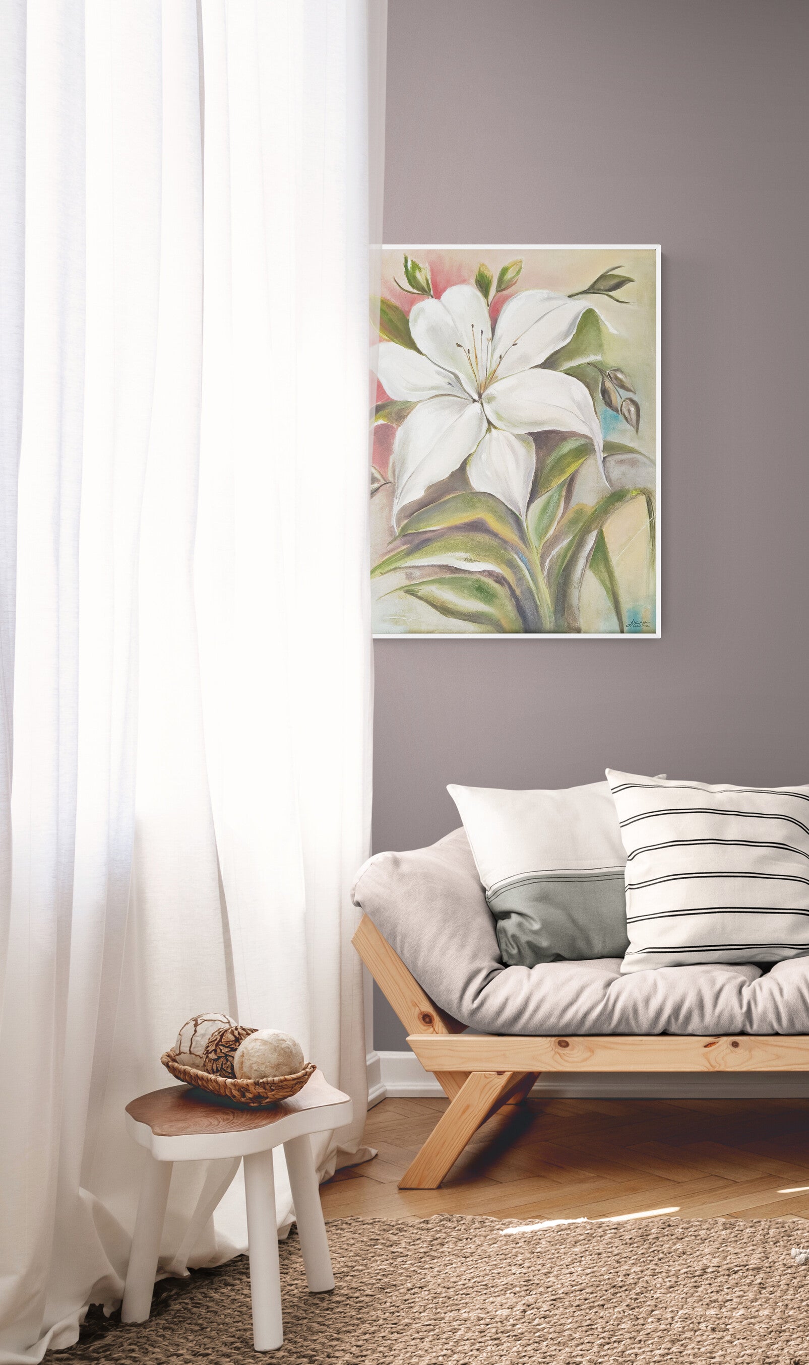 This painting of a single white flower represents purity, simplicity and elegance.