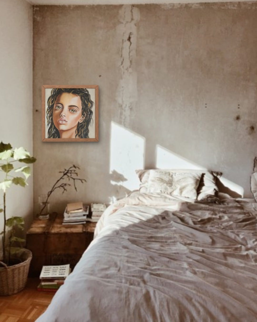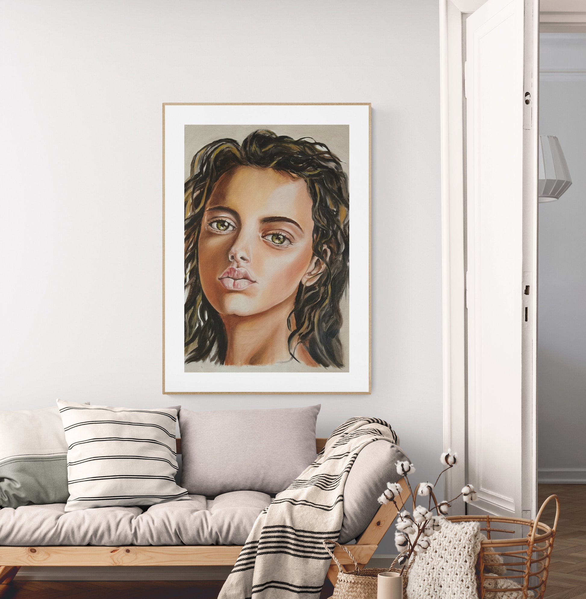 The painting celebrates the beauty and grace of a woman. The eyes are the highlight of the composition, revealing a kaleidoscope of feelings - strength, vulnerability, longing and wisdom - all at once.