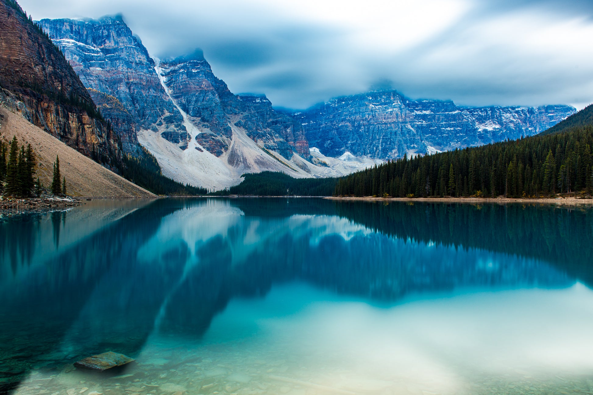 Nestled amidst towering peaks, the serene waters mirror the grandeur of nature's masterpiece, casting a spell of enchantment upon all who behold its breathtaking beauty. Lake Moraine, Banff Canada
