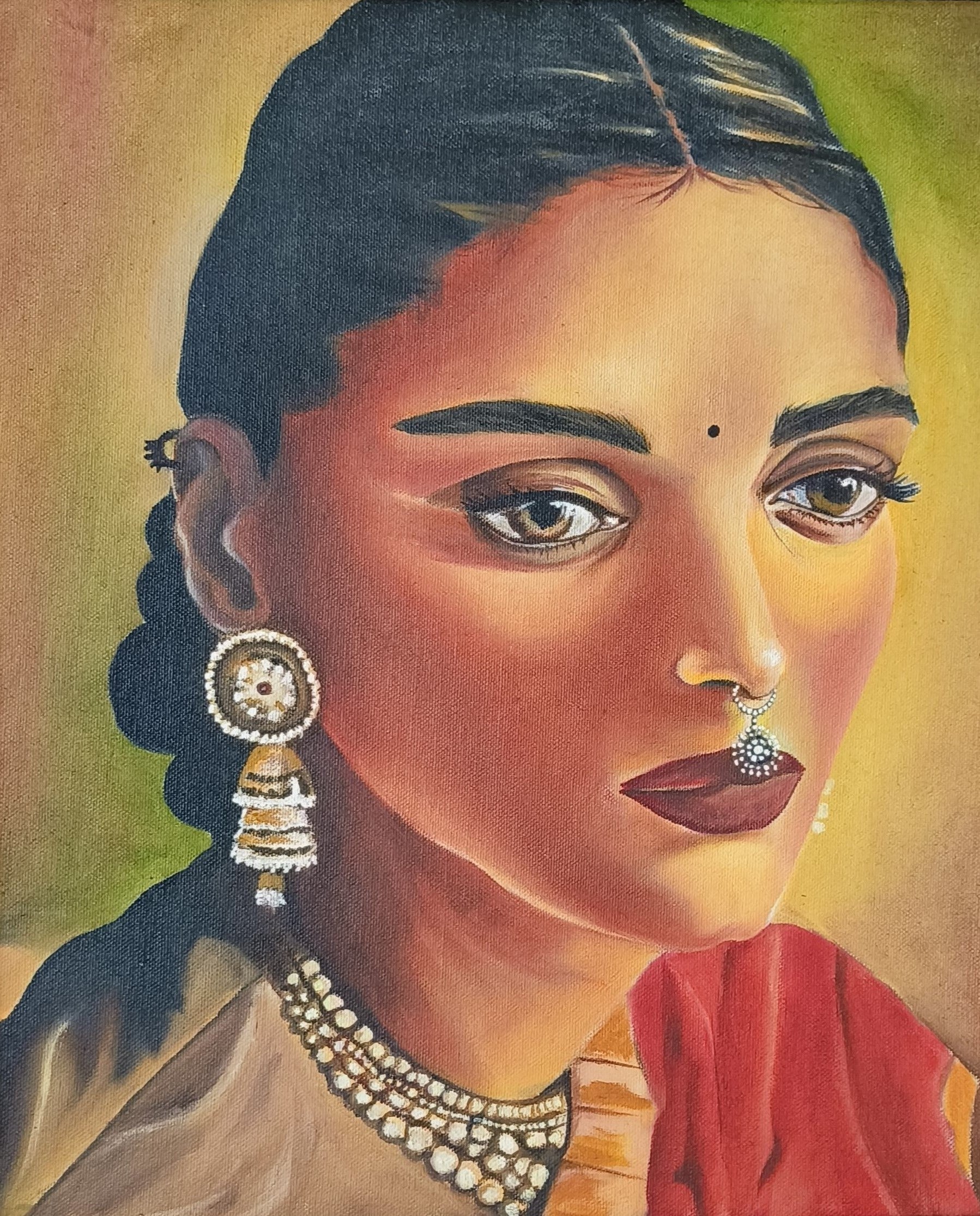 This Raja Ravi Varma inspired painting is a celebration of feminine grace and elegance, beautifully delving into the depths of human emotion.