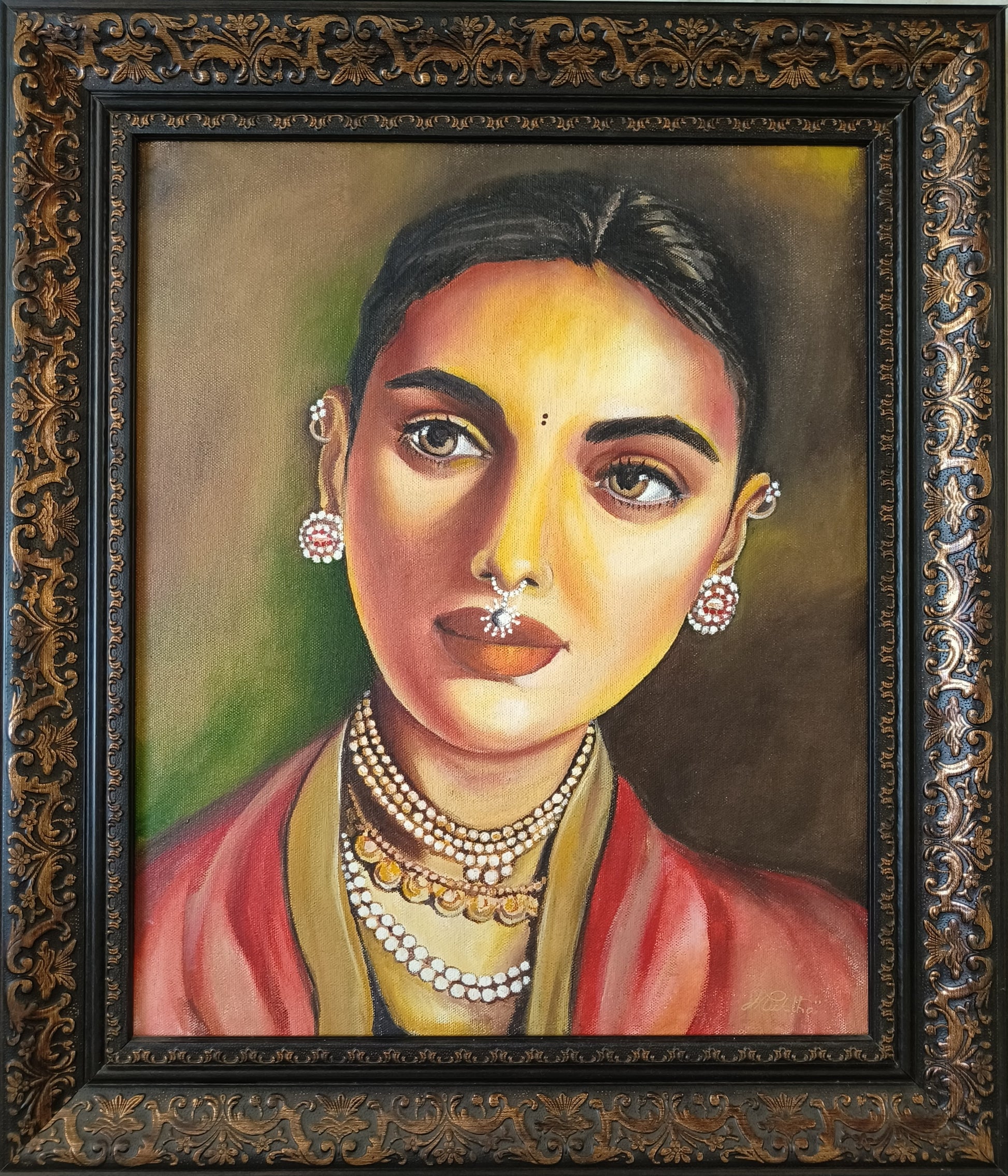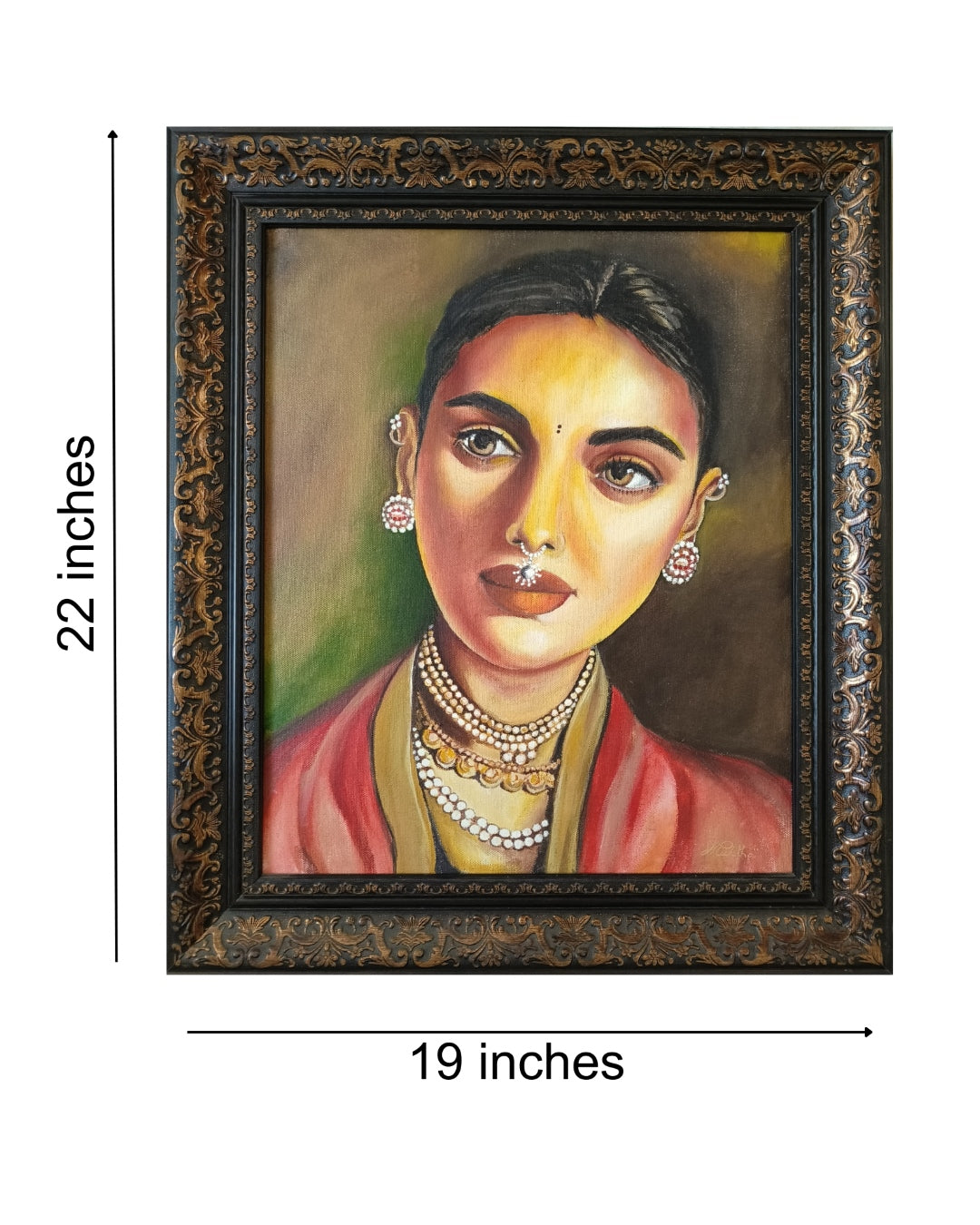 Technique | Oil on canvas using brush, realistic portrayal.Other Details | Artwork framed using synthetic fiber frame in bronze color with ornate patterns and antique look that compliments the artwork.