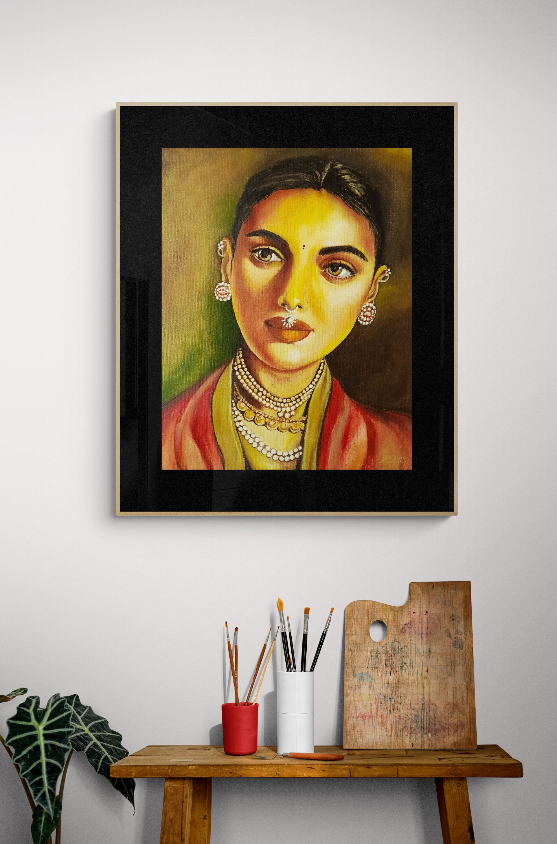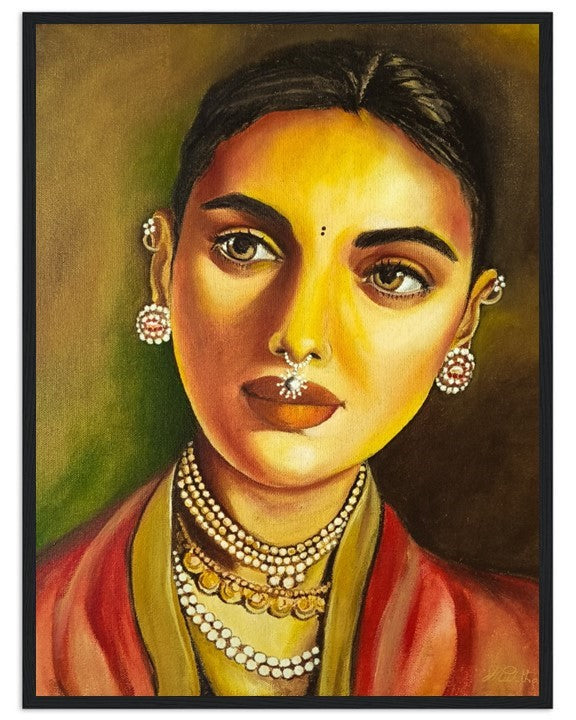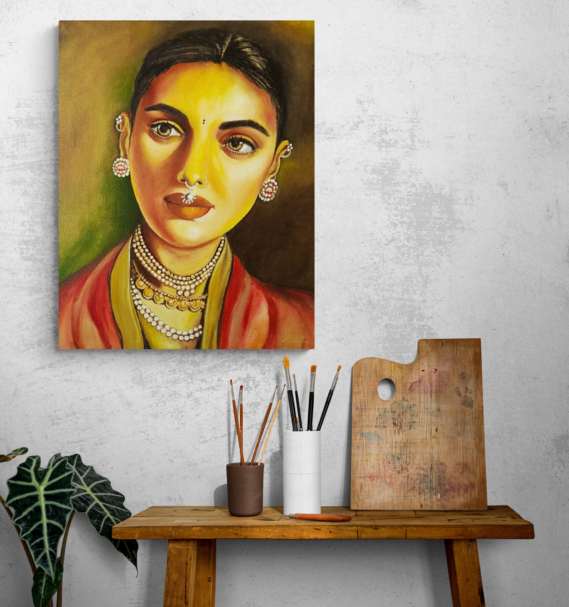 The painting pays homage to the timeless style of Raja Ravi Varma, the legendary Indian artist who captured the grace and beauty of women in the grandeur of Indian tradition. The subtle expressions in the painting convey the inner thoughts and emotions, drawing the viewer into their world.