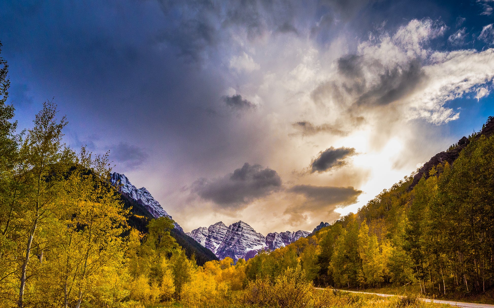 In the crisp embrace of fall season, the Maroon Bells rise majestically, their snow-dusted peaks contrasting against a tapestry of fiery autumn foliage.