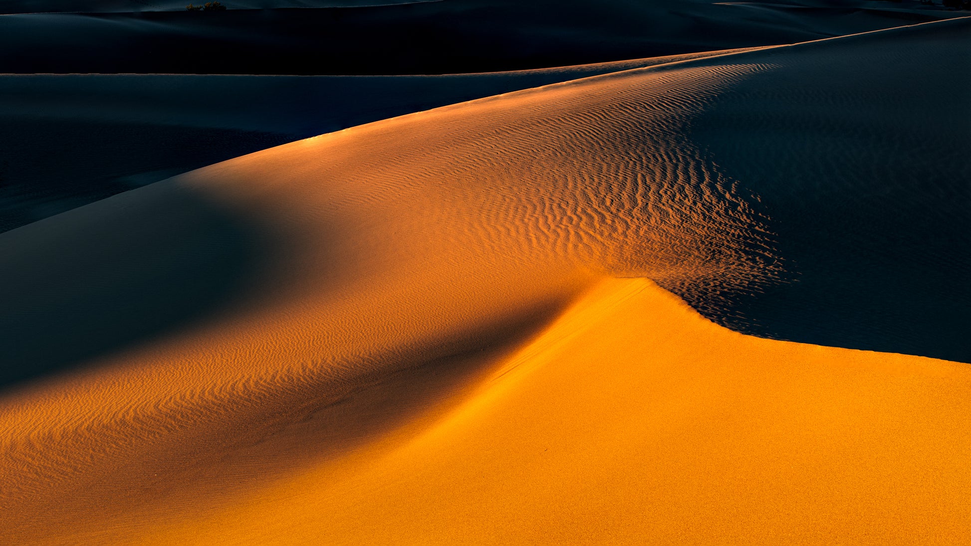 In the heart of a valley, the sand dunes rise like undulating waves frozen in time, their golden hues shimmering under the relentless gaze of the sun. Death Valley