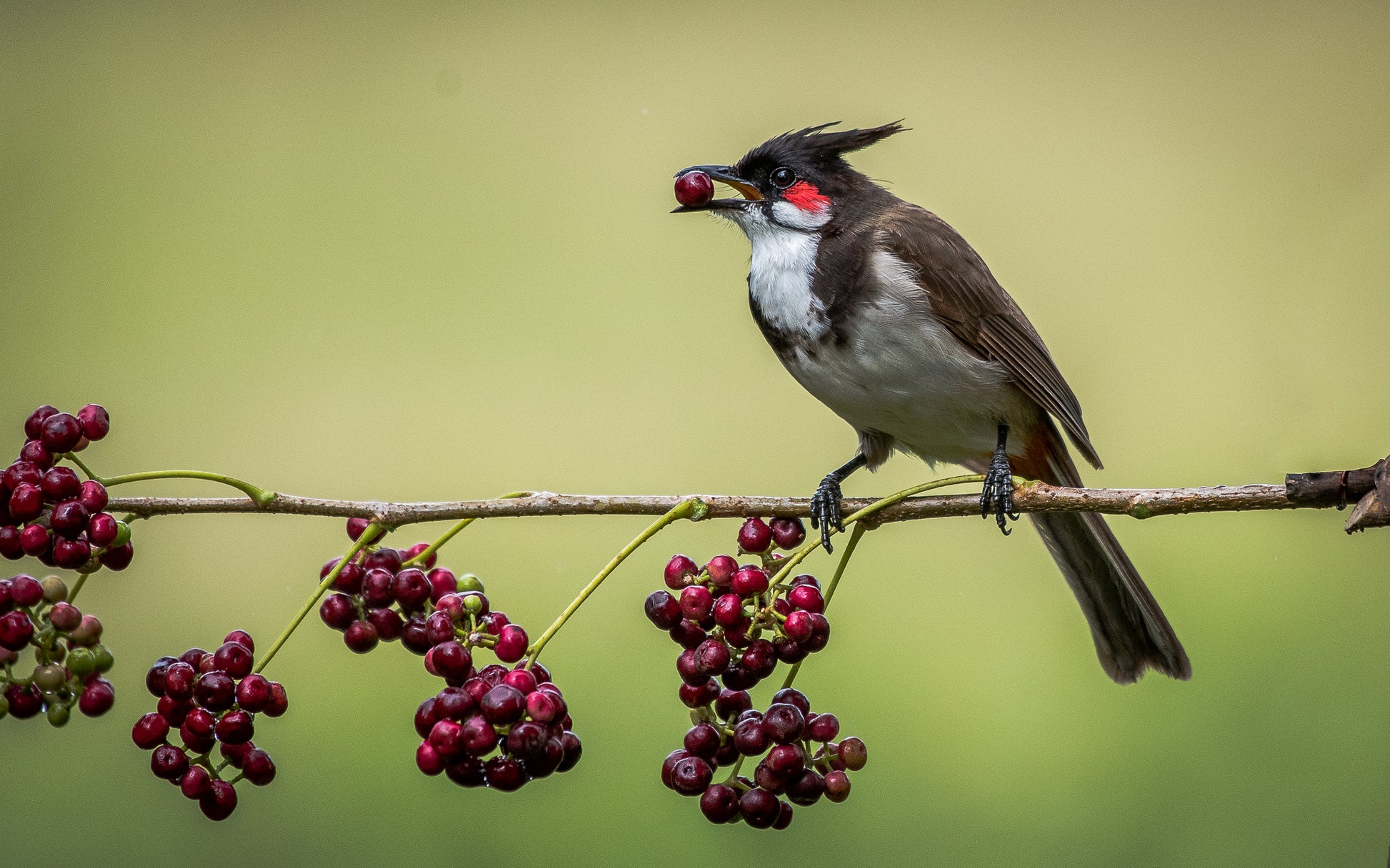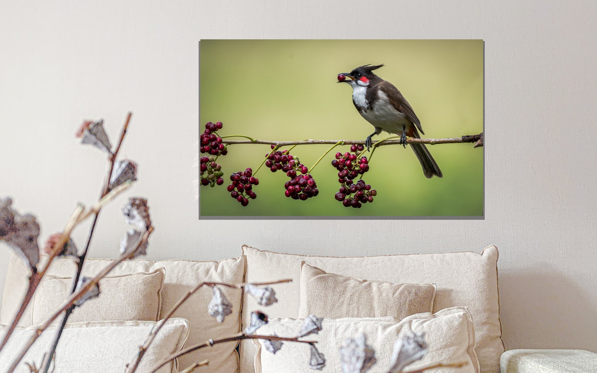 "Immerse yourself in the vibrant hues of nature. Witness the moment frozen in time as the bird delicately cradles a luscious berry in its beak, where every feather and every detail tells a vivid story."