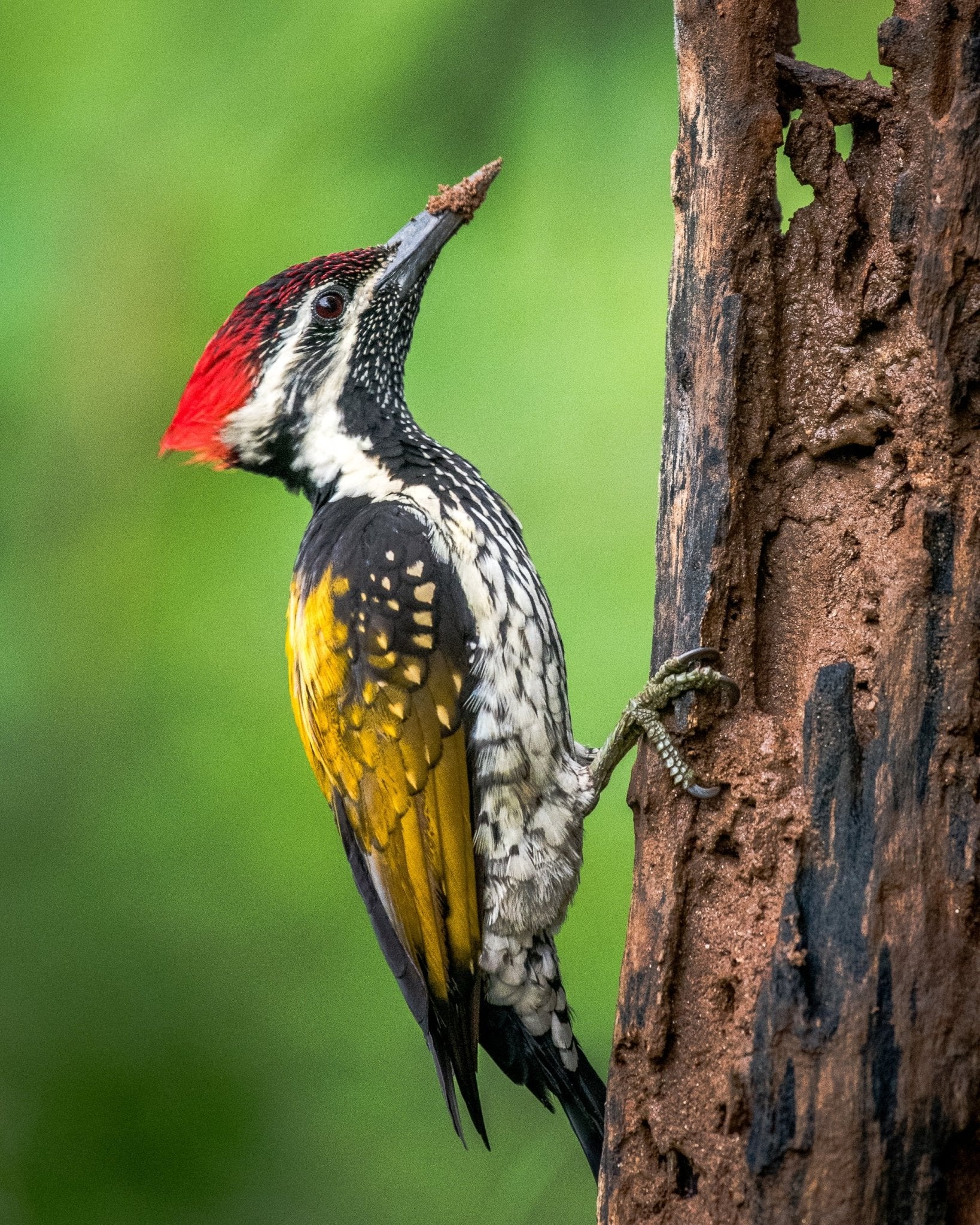 In the dappled light of the forest, the dazzler emerges as a vibrant jewel amidst the verdant foliage, its crimson crown and ebony plumage a striking contrast against the emerald canvas of nature. Readheaded Woodpecker.